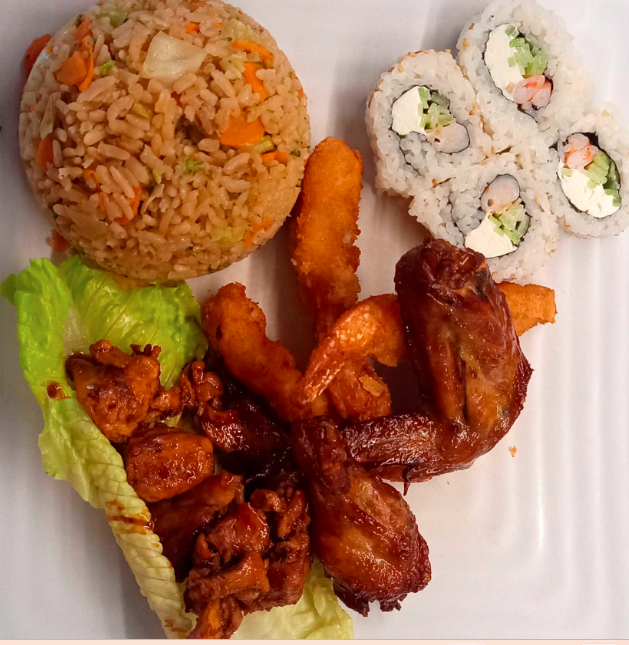 Camarones empanizados ebi furai*1 + Teba age alitas de pollo*1 + Pollo con salsa dulce teriyaki de pollo*1 + arroz blanco gohan*1 + 4 piezas sushi Philadelphia de camarón*1 + Gelatina de café*1