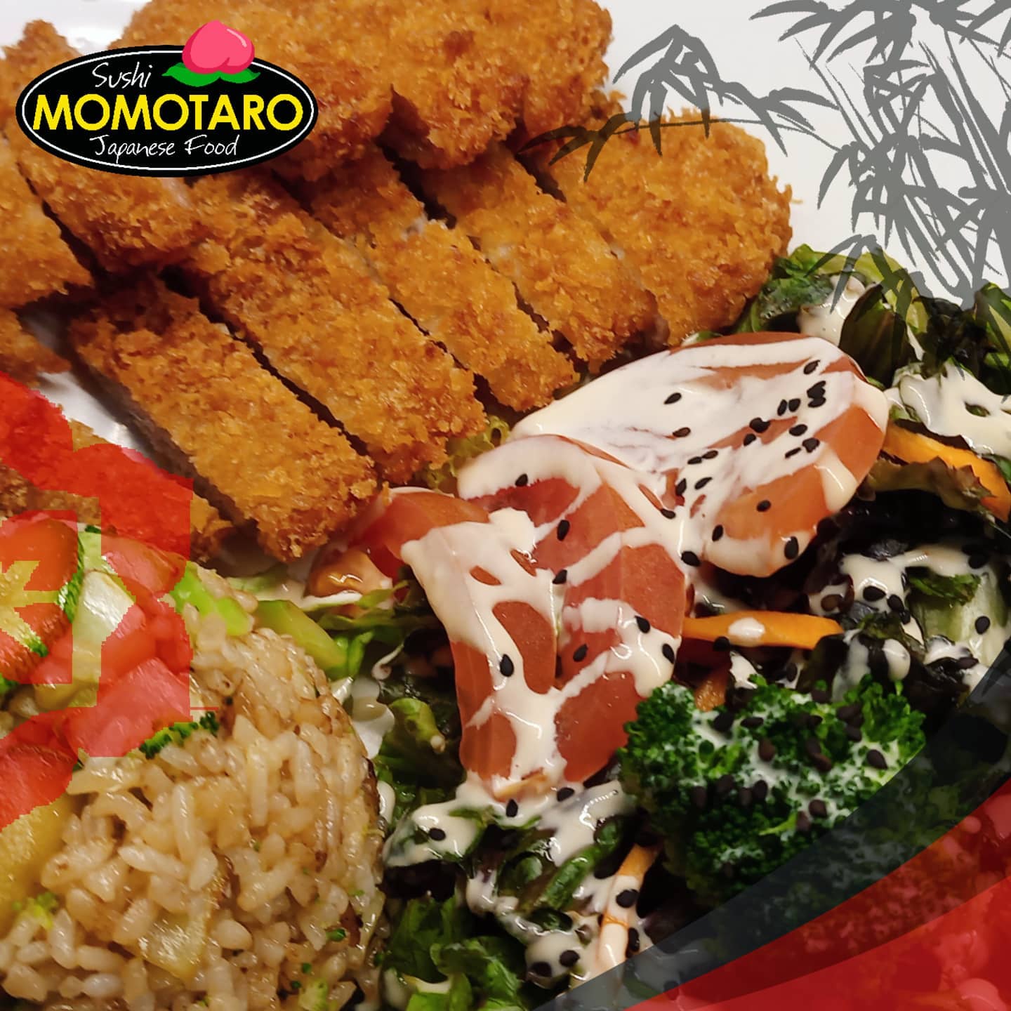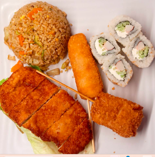 Delicioso combo con brocheta de surimi, menchi katsu, camarón y filete de pescado empanizados. Acompañado de arroz a tu elección.