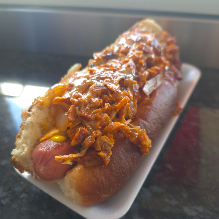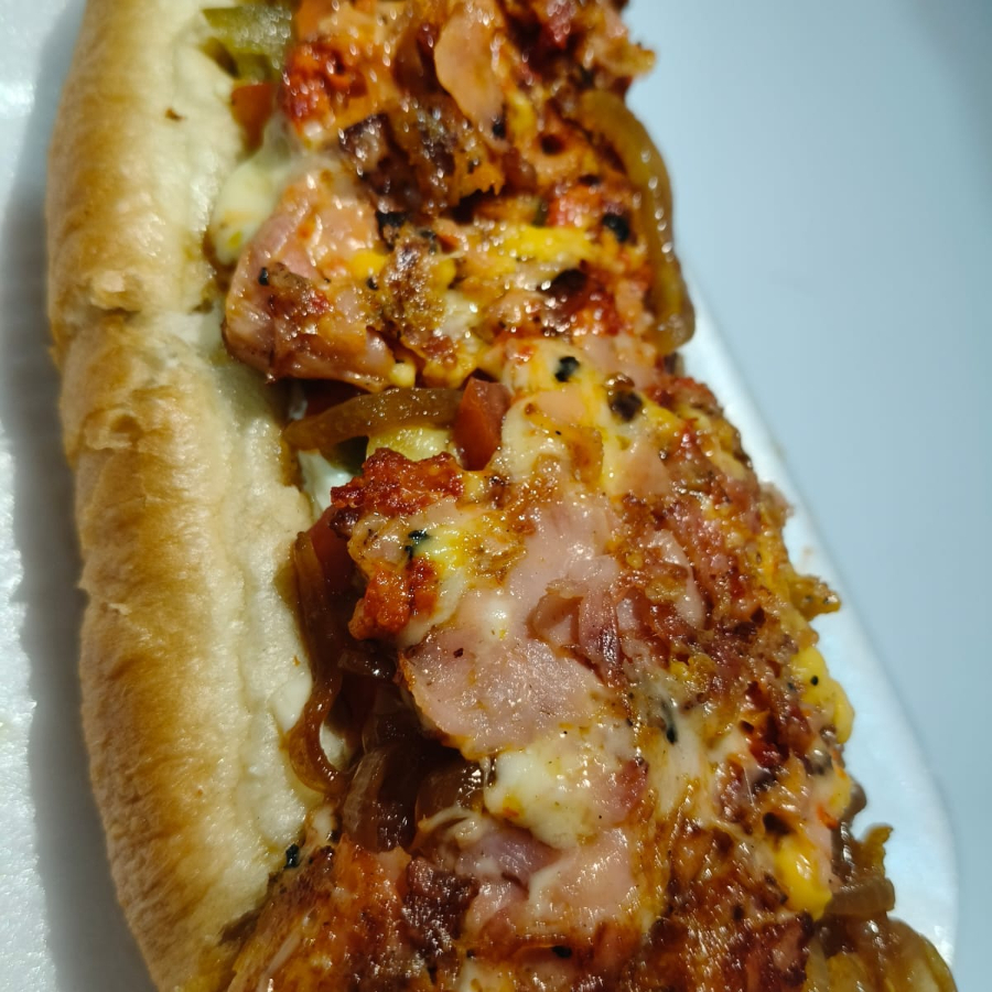 Pan casero 20 cm, salchicha envuelta en tocino, jitomate, chile envinagre, cebolla caramelizada, ruffles, catsup, mostaza, chimichurri, chorizo, jamon, queso amarillo y queso asadero. acompañado de chimichurri y catshup.