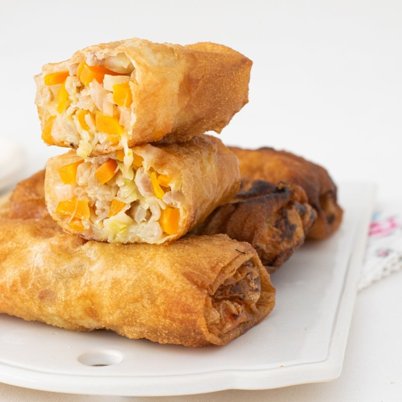 4 rollitos primavera relleno de, col, zanahoria, ejotes y fideos.