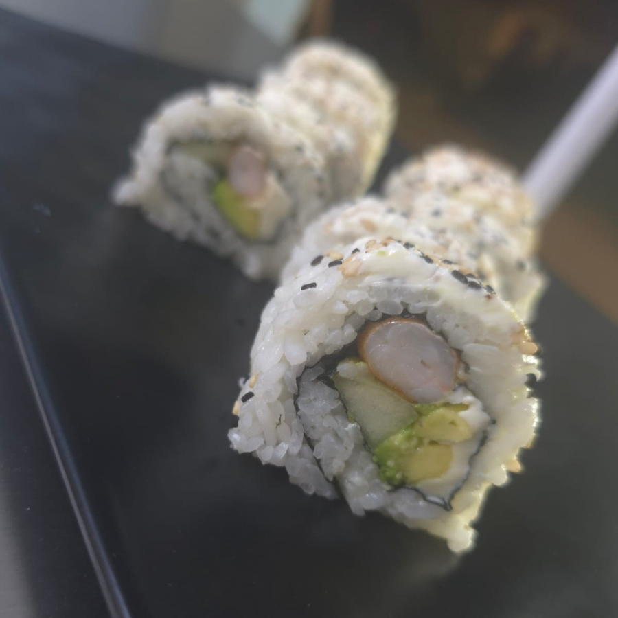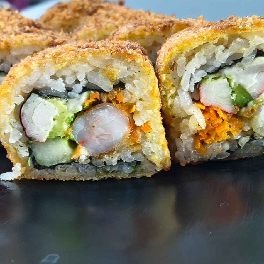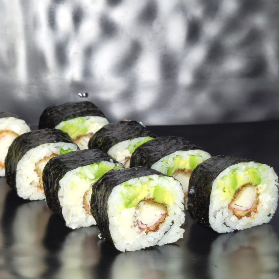 Rollo frio envuento en alga nori, relleno de aguacate, queso crema y surimi empanizado. Acompañado de aderezo de chipotle y salsa de soya.