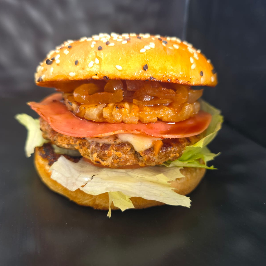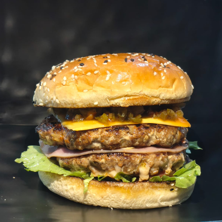 Doble carne 150g cada una, jamon, queso amarillo, chile envinagre, lechuga y jitomate.