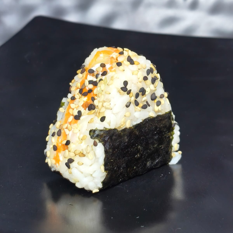 Triangulo de arroz, relleno de queso crema, pepino, zanahoria, espolvoreado de ajonjoi y cubierto de un pequeña porcion de alga nori.