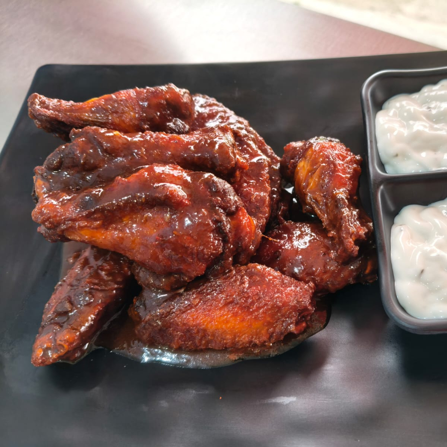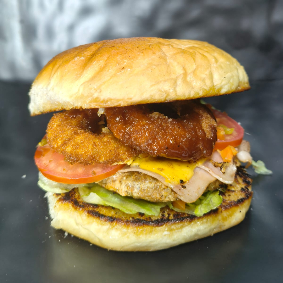 pan, 150 g de carne molida mixta bañada en salsa BBQ, jamon , queso amarillo, jitomate, chile envinagre y aros de cebolla bañadas en BBQ.