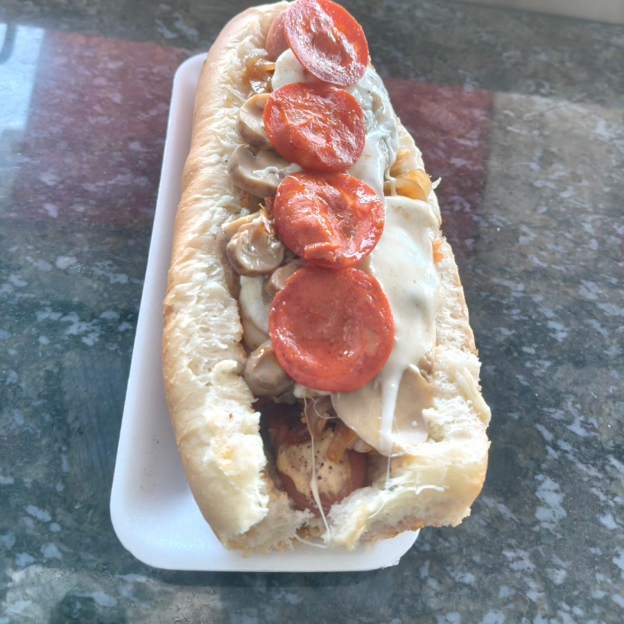 Pan casero 20 cm, salchicha envuelta en tocino, jitomate, chile envinagre, cebolla caramelizada, ruffles, catsup, mostaza, chimichurri, champiñones, queso asadero y peperoni. acompañado de chimichurri y catshup.