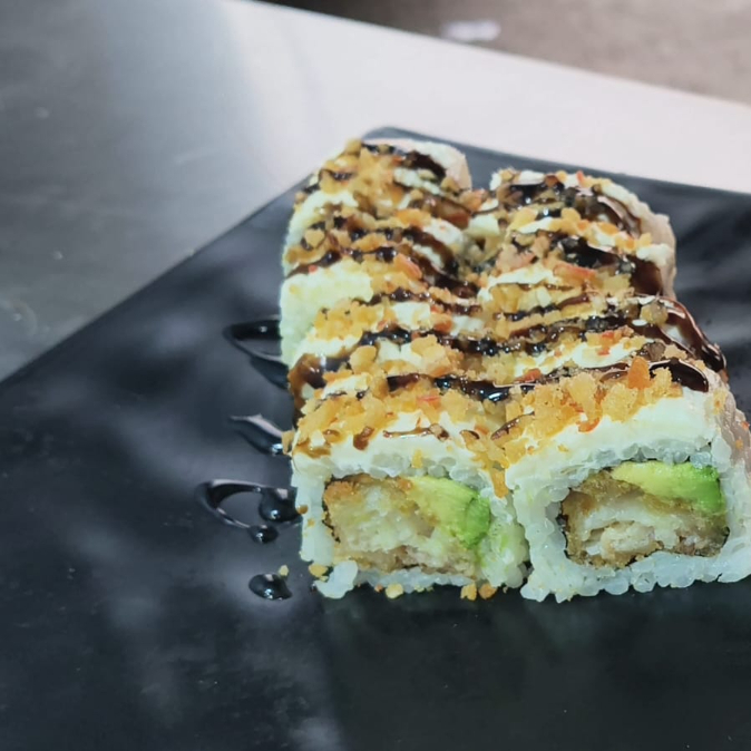 Arroz con cubierta de masago(hueva de pescado), relleno de filete de pescado empanizado, queso crema y aguacate.