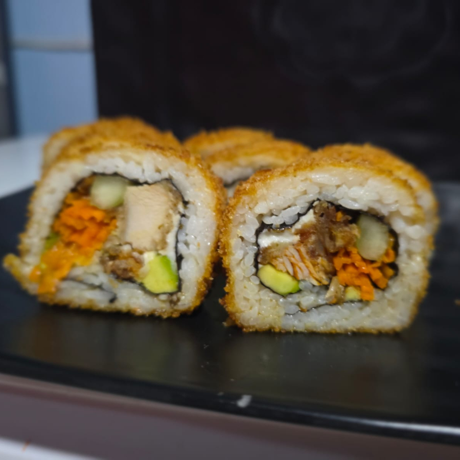 Rollo frio, relleno de aguacate, pepino, zanahoria, queso crema y pollo empanizado, espolvoreado de ajonjoli y acompañado de aderezo de chipotle y salsa de soya.