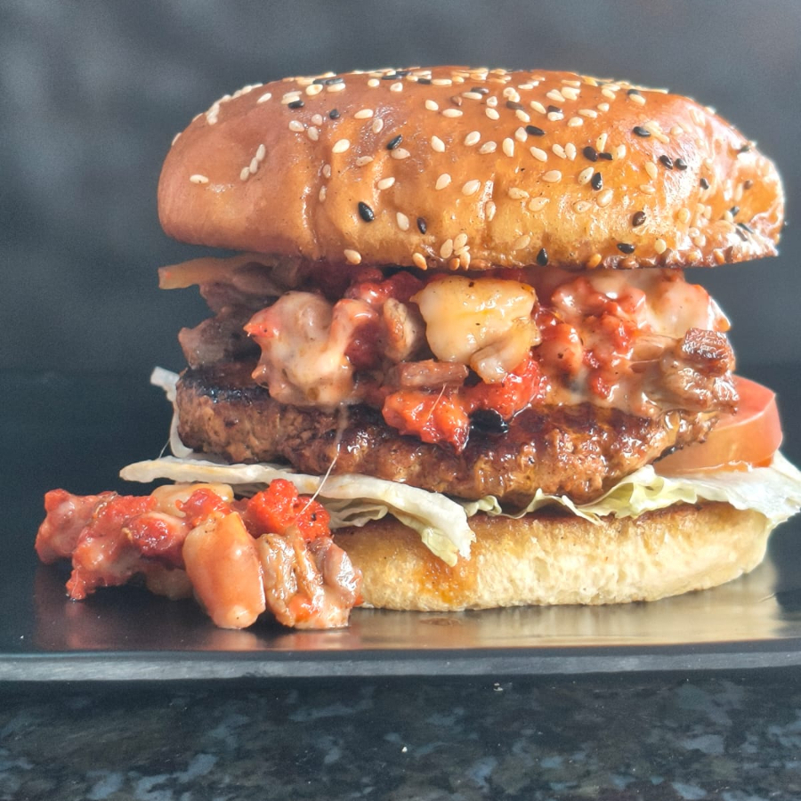 Carne mixta 150g rellena de queso asadero, bañada de queso asadero, lechuga, jitomate, cebolla caramelizada y chile en vinagre