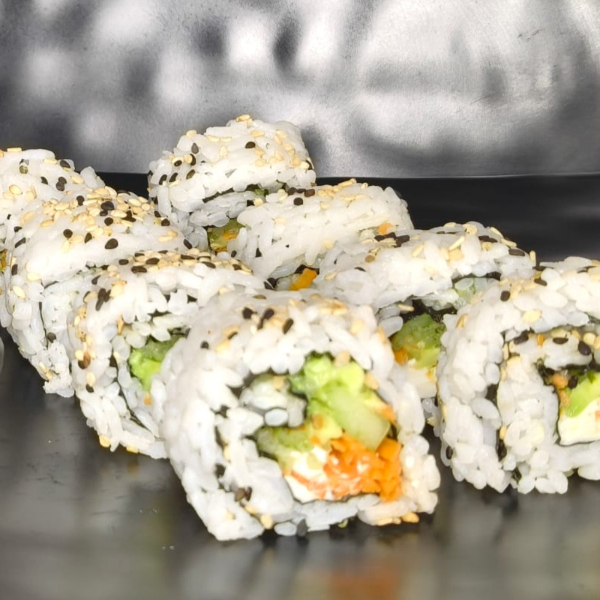 Rollo frio, relleno de aguacate, pepino, zanahoria y queso crema, espolvoreado de ajonjoli. Acompañado de aderezo de chipotle y salsa de soya.