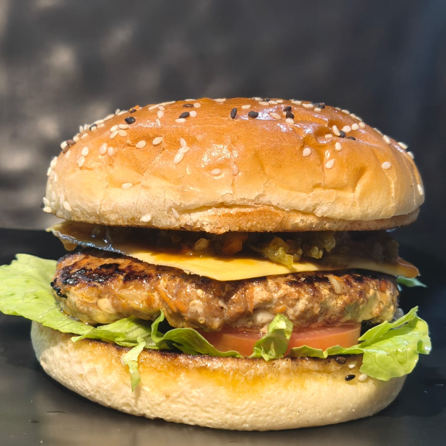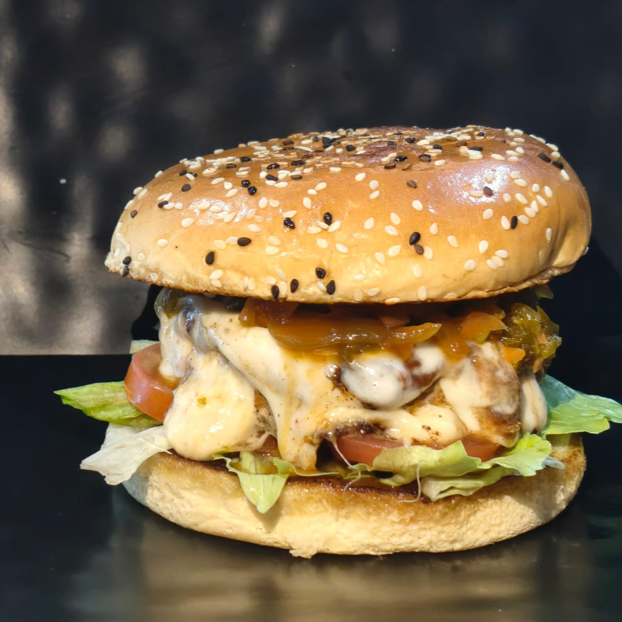pan , 150 g de carne molida mixta , queso amarillo, jitomate, chile envinagre, cebolla caramelizada.