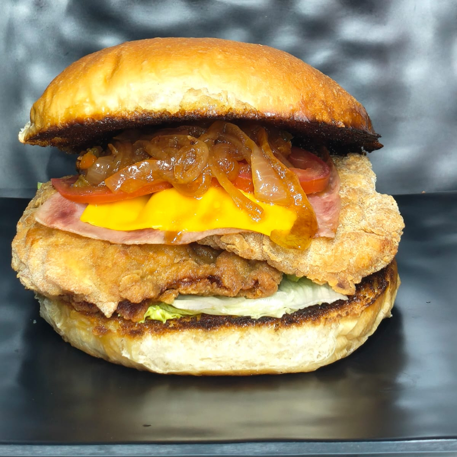 pan , pollo empanizado , queso amarillo, jitomate, chile envinagre, cebolla caramelizada