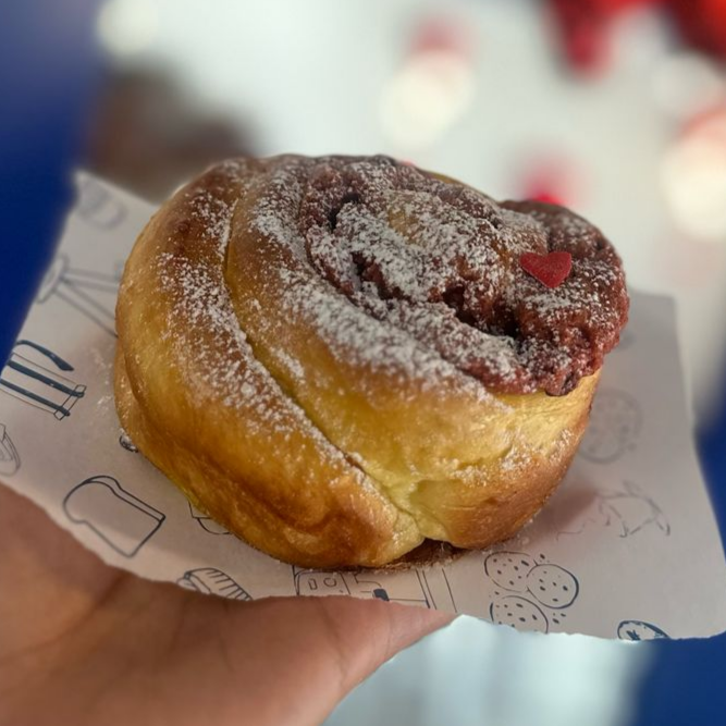 Rol de canela relleno con galleta de chispas de chocolate.