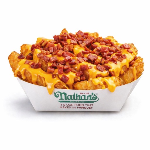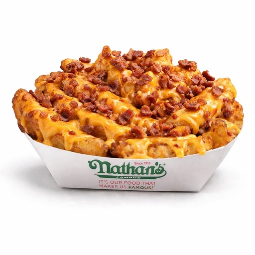 Nuestras clásicas onduladas papas a la francesa preparadas con salsa de queso cheddar y trocitos de tocino