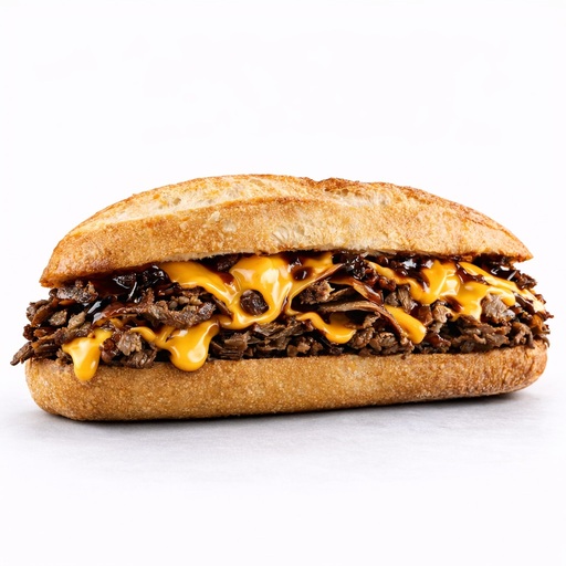 Tal y como servimos en NY, pan baguette, carne 100% de res, cebolla caramelizada, queso americano y mayonesa steaksauce