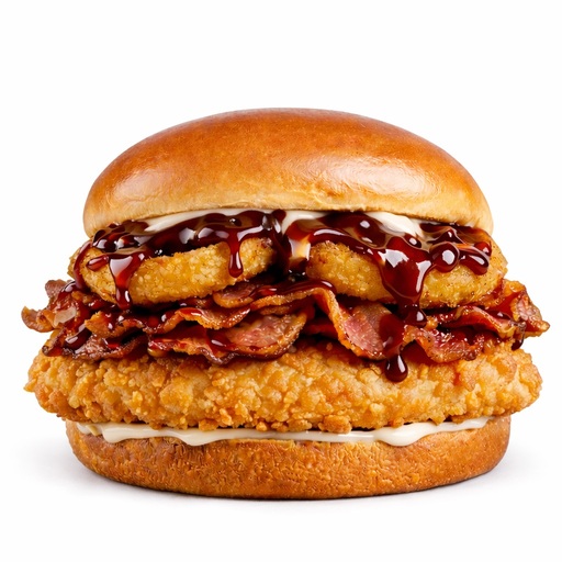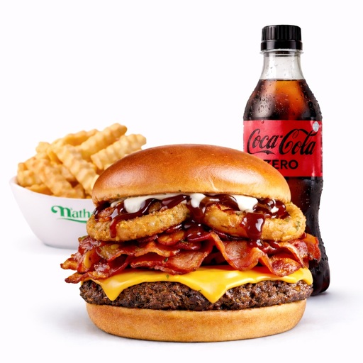 Una o dos jugosas carnes de res Angus,salsa BBQ,onion rings,strips de tocino,lechuga,jitomate y queso americano servido sobre pan brioche