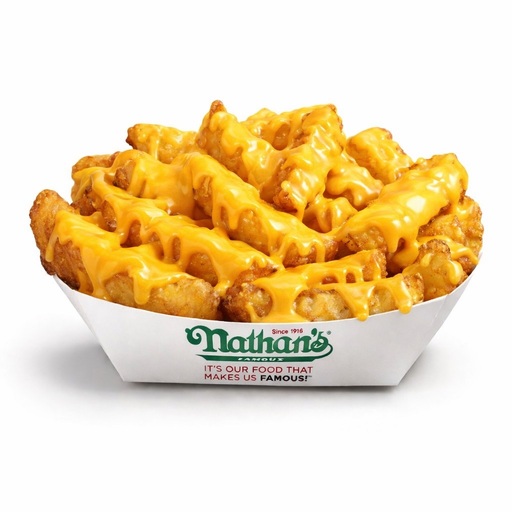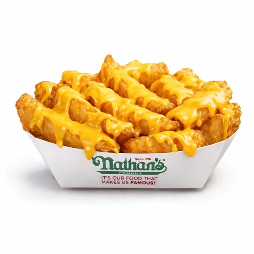 Nuestras clásicas onduladas papas a la francesa preparadas con salsa de queso cheddar
