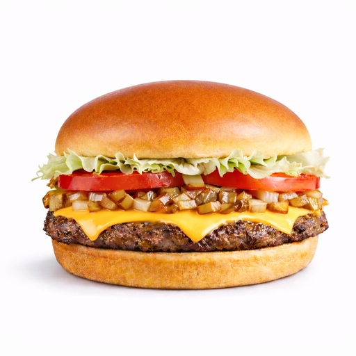 Una o dos jugosas carnes de res anguns de 4oz, mayonesa, lechuga, jitomate, cebolla , pepinillos , cátsup , queso americano sobre pan brioche.