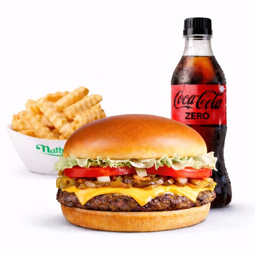 Una hamburguesa NY Cheese Steak ,unas papas y elección de bebida. Elección de toppings disponible