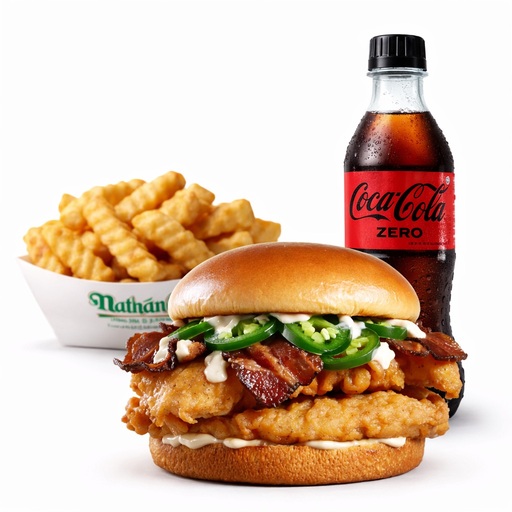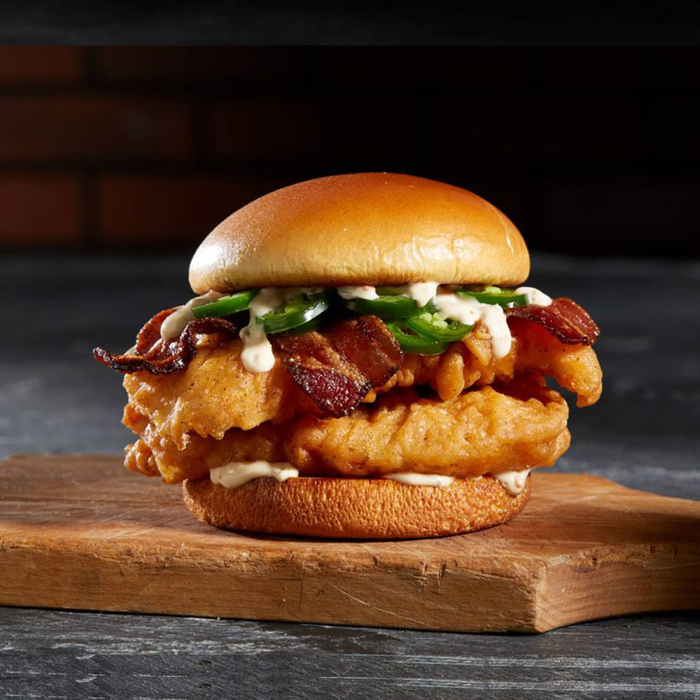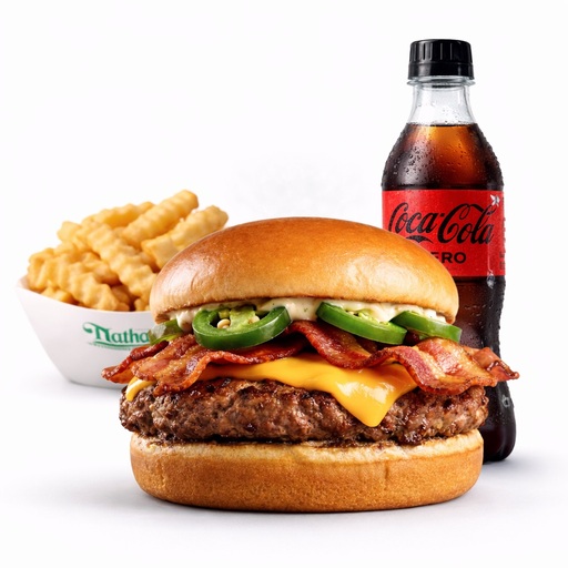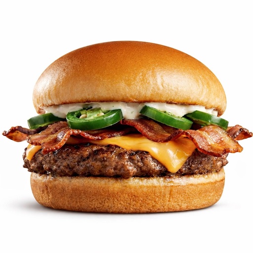 Una o dos jugosas carnes de res Angus de 4oz, aderezo jalapeño ranch, chiles jalapeños, strips de tocino y queso americano , servido sobre pan brioche