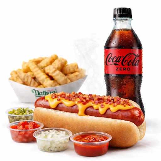 Un hot dog Cheese Bacon con tu eleccion de toppings, 250g de papas y tu eleccion de bebida.