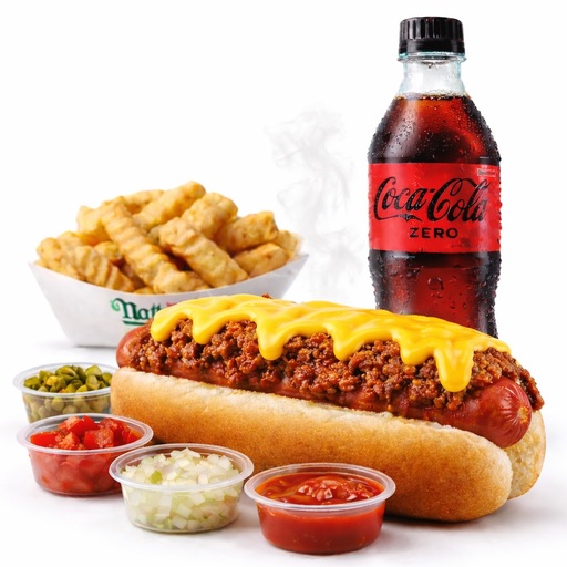 Un hot dog Chili Cheese con tu elección de toppings, 250g de papas y tu eleccion de bebida.