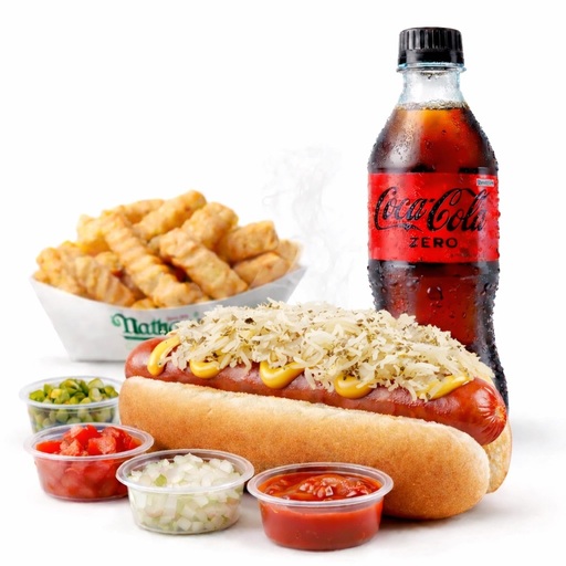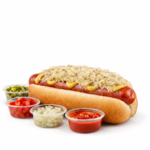 Un hot dog Sauerkraut con tu eleccion de toppings, 250g de papas y tu eleccion de bebida.