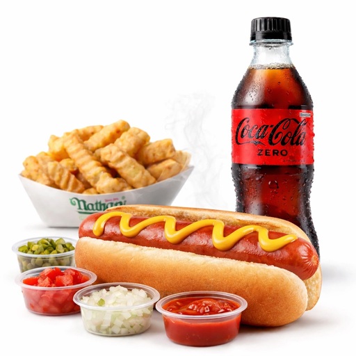 Un hot dog con tu eleccion de toppings, 250g de papas y tu eleccion de bebida.
