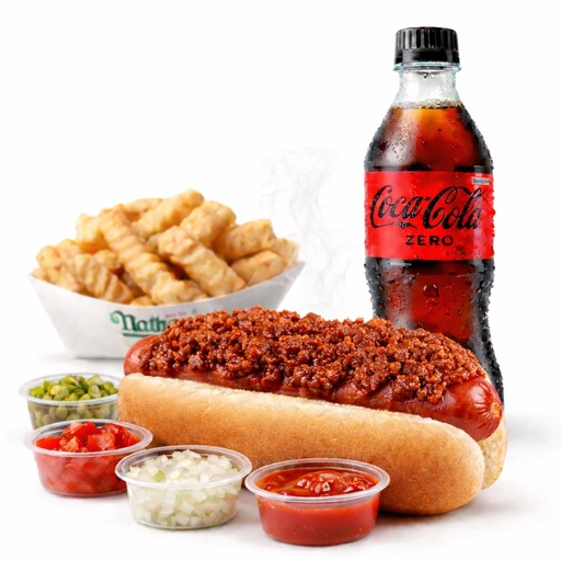 Un hot dog Chili con tu eleccion de toppings, 250g de papas y tu eleccion de bebida.