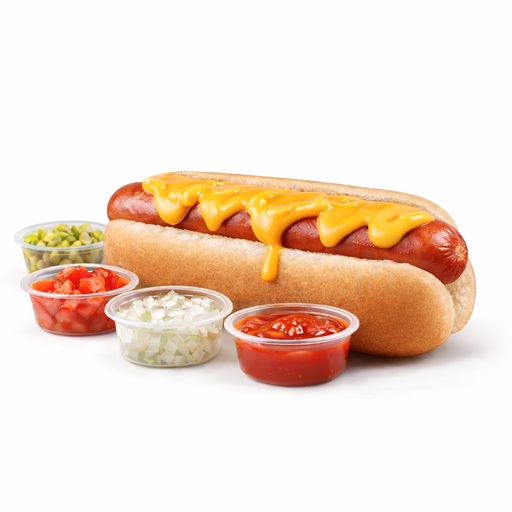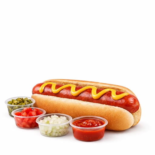 Salchicha 100% de res desde NY, acompañado de catsup, mayonesa y mostaza. Con tu eleccion de toppings