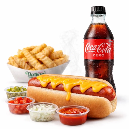 Un hot dog Cheese con tu eleccion de toppings, 250g de papas y tu eleccion de bebida.