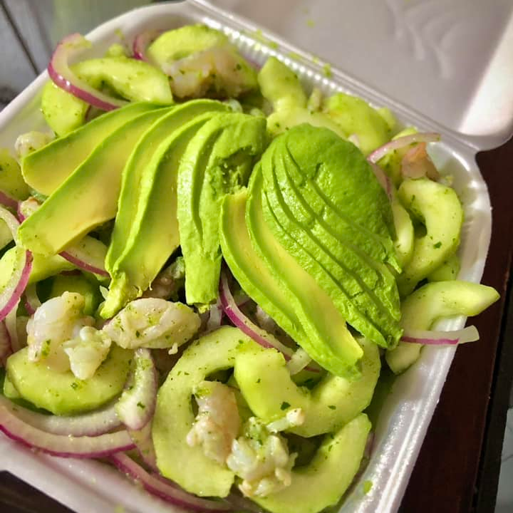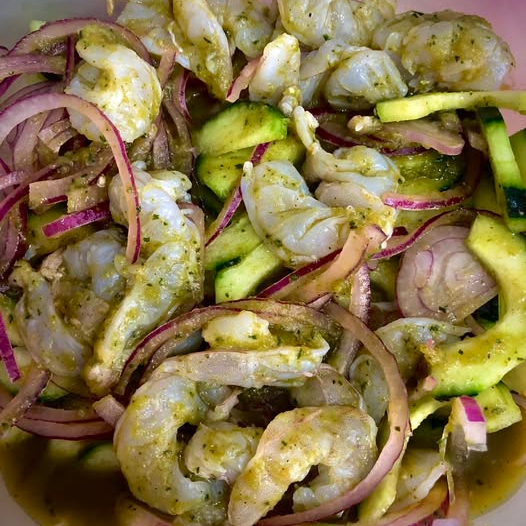 contiene camaron crudo marinado en salsa verde, pepino, cebolla morada y aguacate