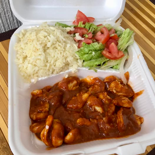 camarones con mantequilla marinados en salsa picosa con chipotle y chile de arbol agridulce con una porcion de arroz, ensalada y galletas saldas