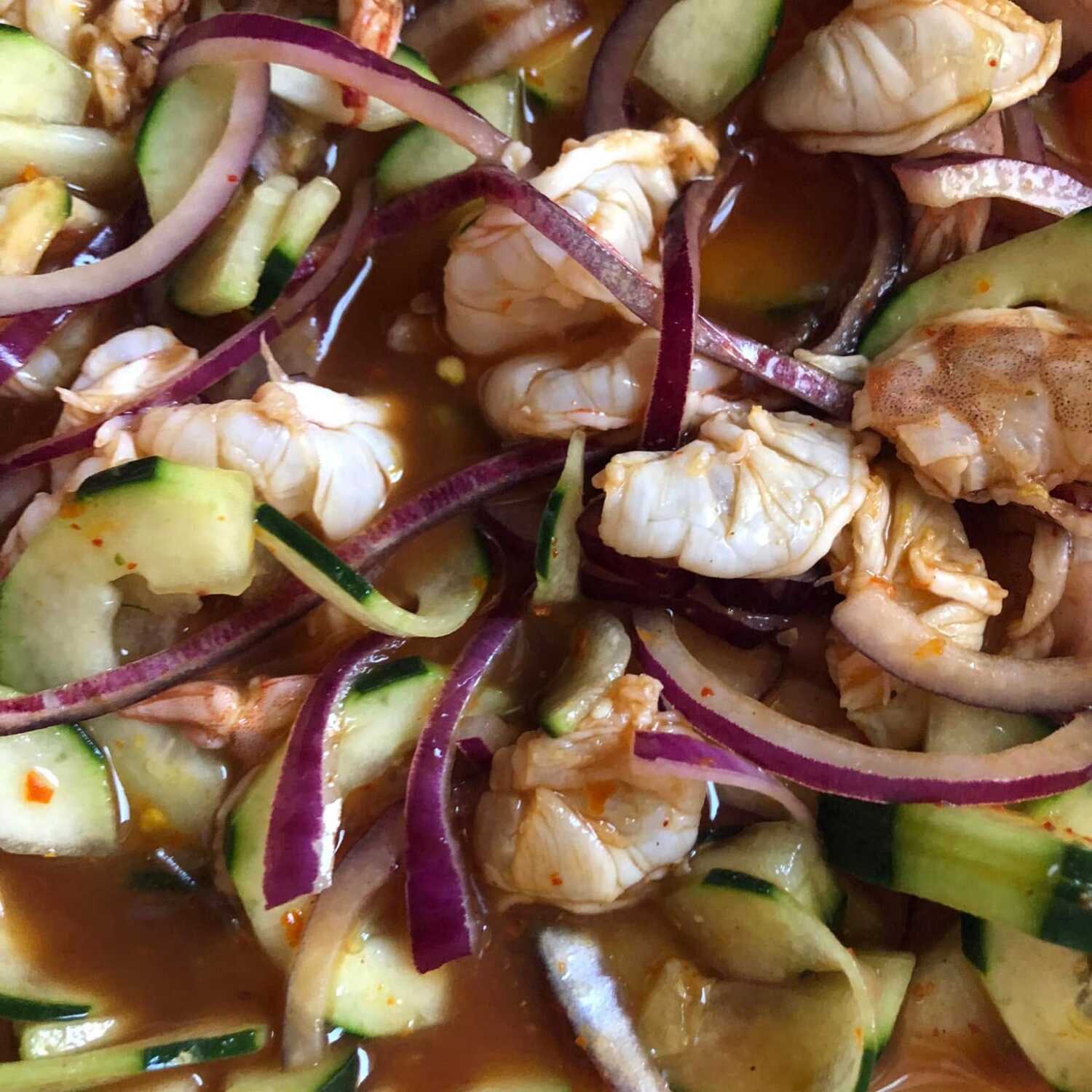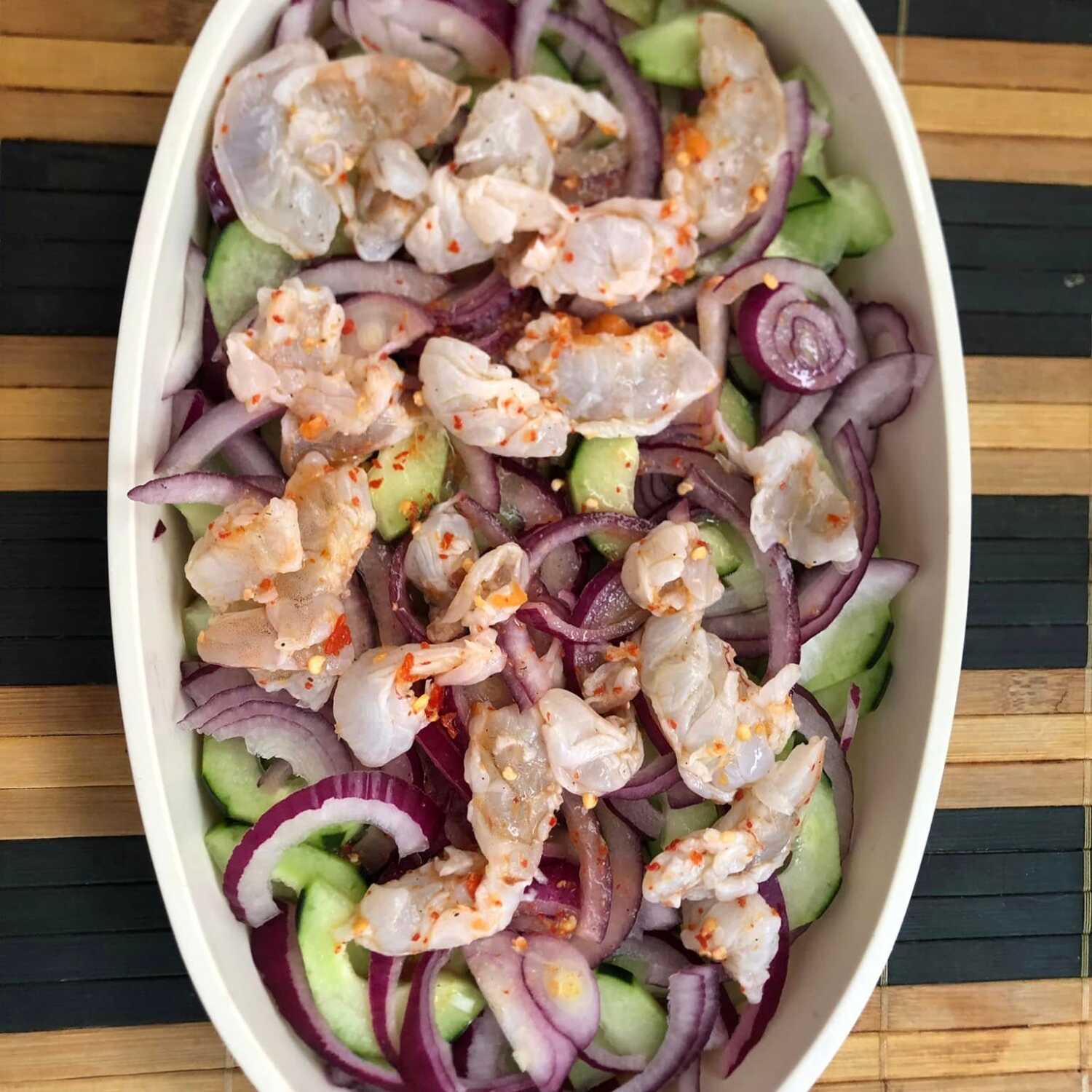 Contiene camaron crudo marinado en salsa roja (picante), pepino y cebolla morada