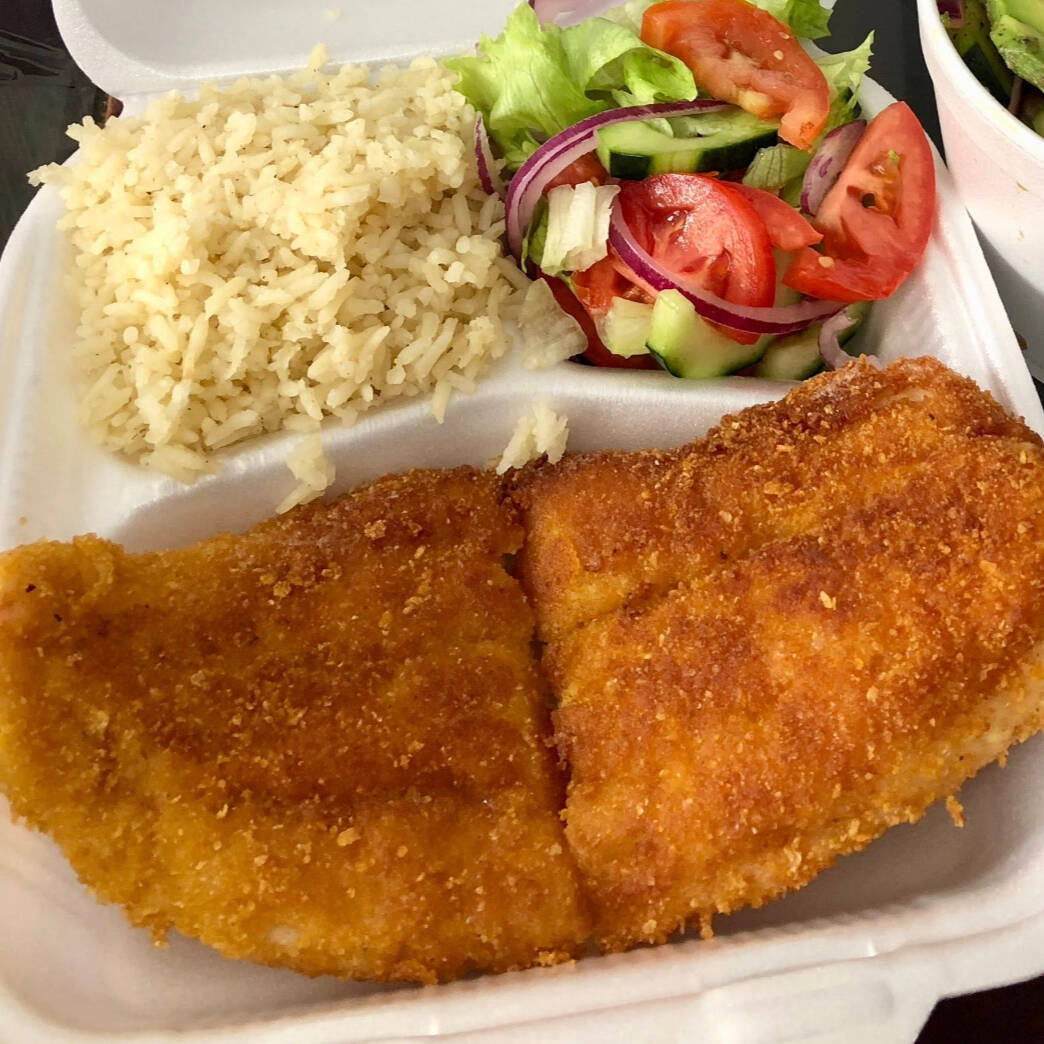 filete de pescado empanizado con su porcion de arroz, ensalada y galletas saladas, incluye salsa de arbol