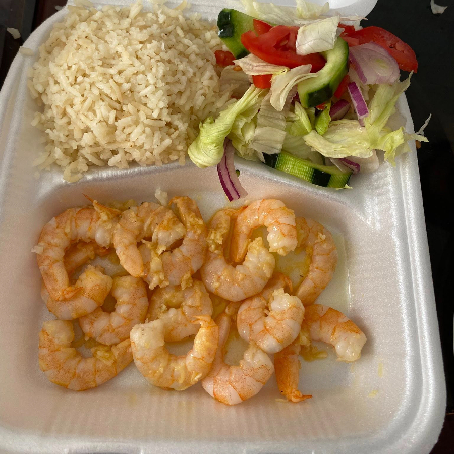 Camarones marinados en mantequilla y ajo, contienen porción de arroz y ensalada, se incluye galletas saladas y salsa de arból