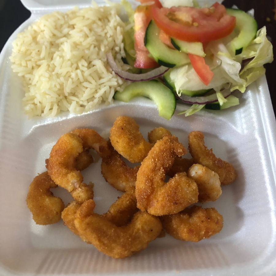 Camarones empanizados con su porción de arroz y ensalada, se envia con galletas y salsa de arboll