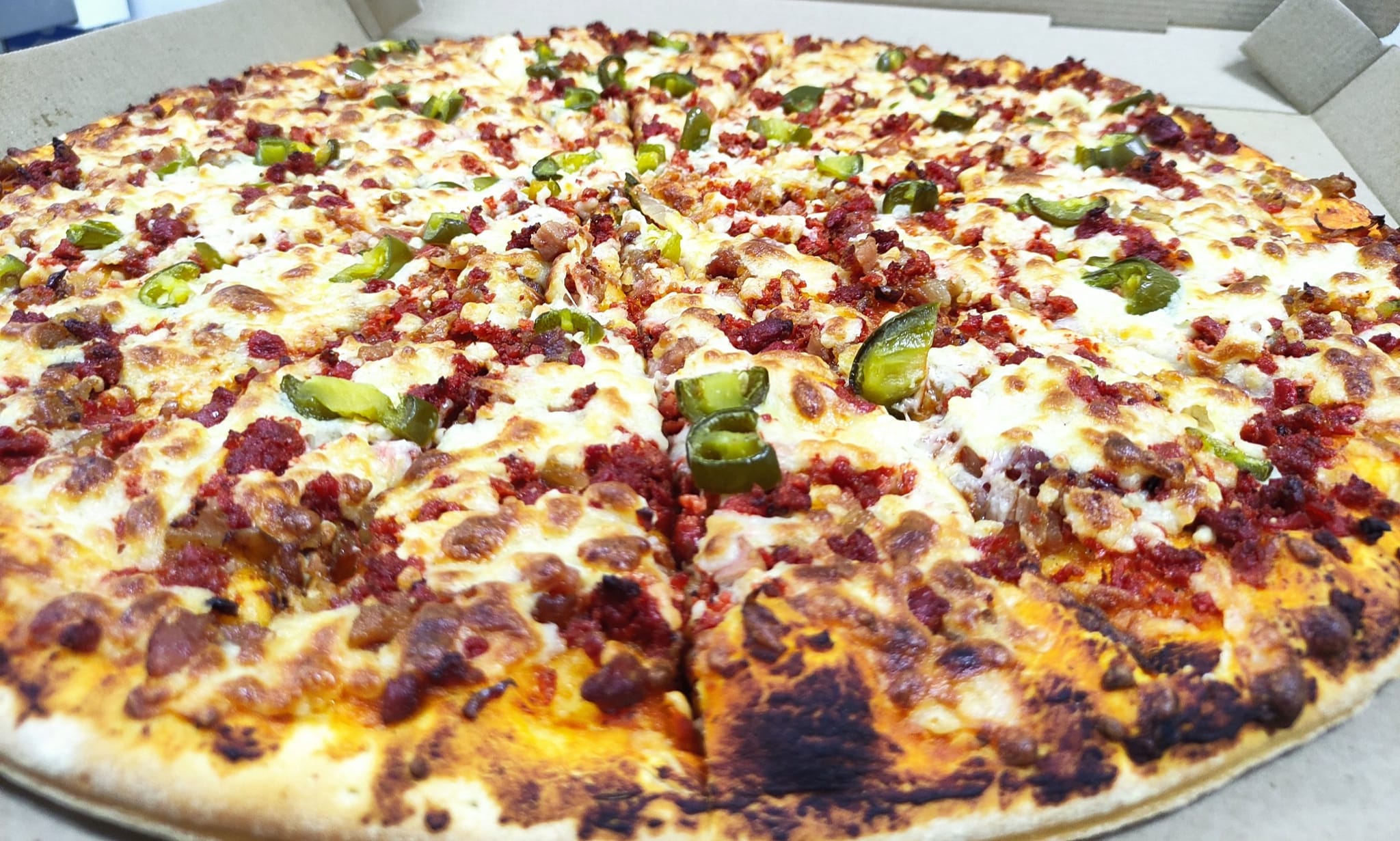 8 Rebanadas, para 2-3 personas. Chorizo, tocino y jalapeño.