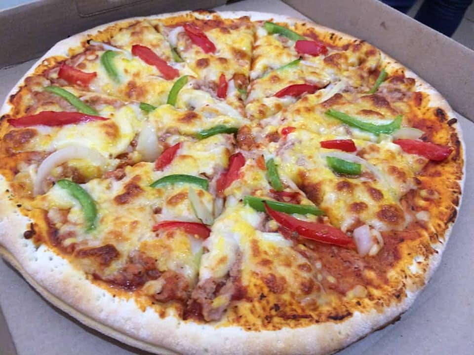 8 Rebanadas, para 1-2 personas. Jamón, chorizo, cebolla, jitomate y pimiento morrón.