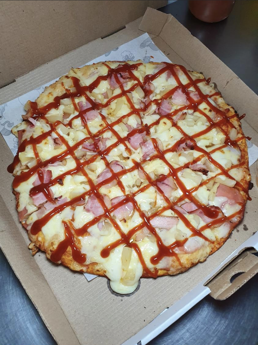 Pizza Grande (36 cm) de Jamón con piña, tocino doradito y salsa bbq. simplemente la mera mera sabrosura