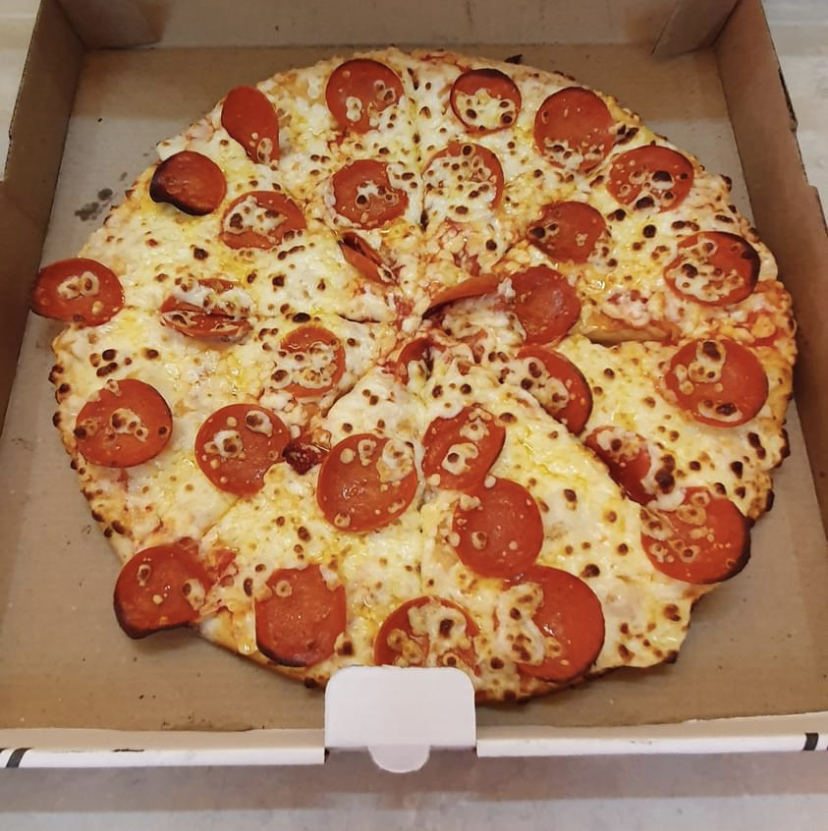 Pizza familiar (12 reb) con champiñones, pepperoni, pimiento verde, aceitunas negras y salchicha