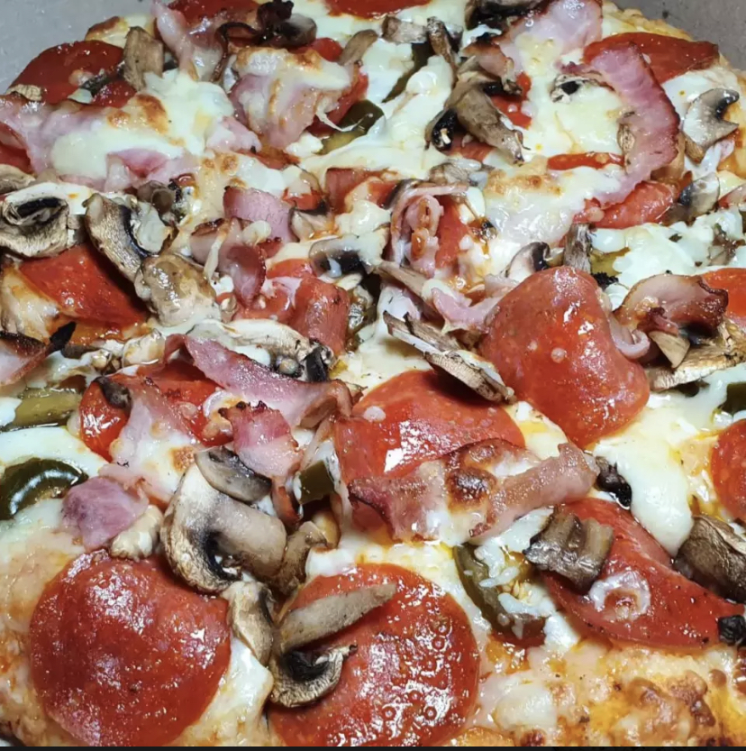 Pizza grande (36 cm) con Champiñones, pepperoni, tocino doradito y jalapeños picositos. esta es super recomendada
