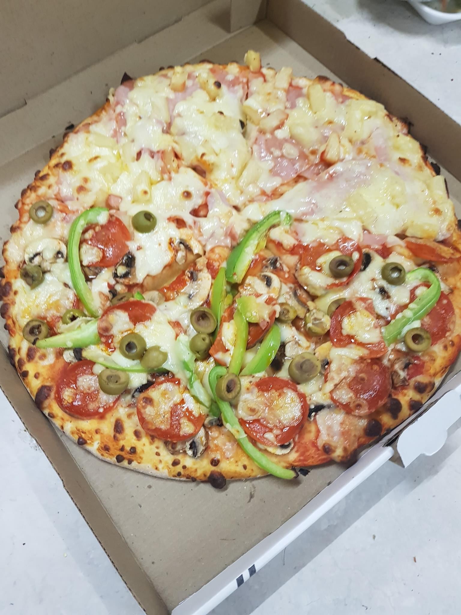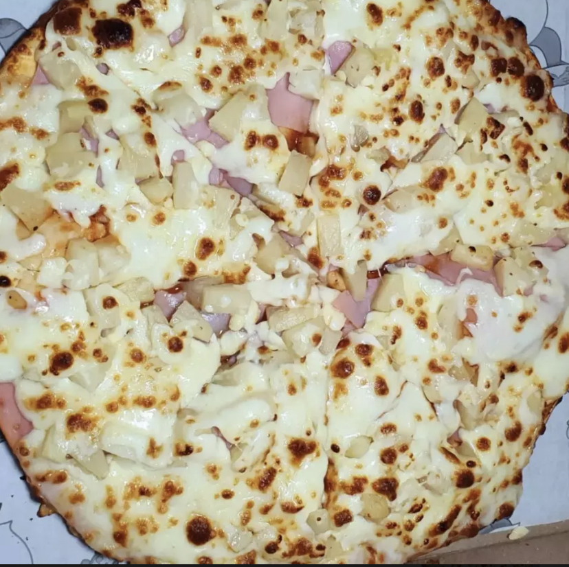 Pizza Familiar (40 cm) de Jamón con salchicha, champiñones, piña y pimiento verde. la combinacion perfecta !!