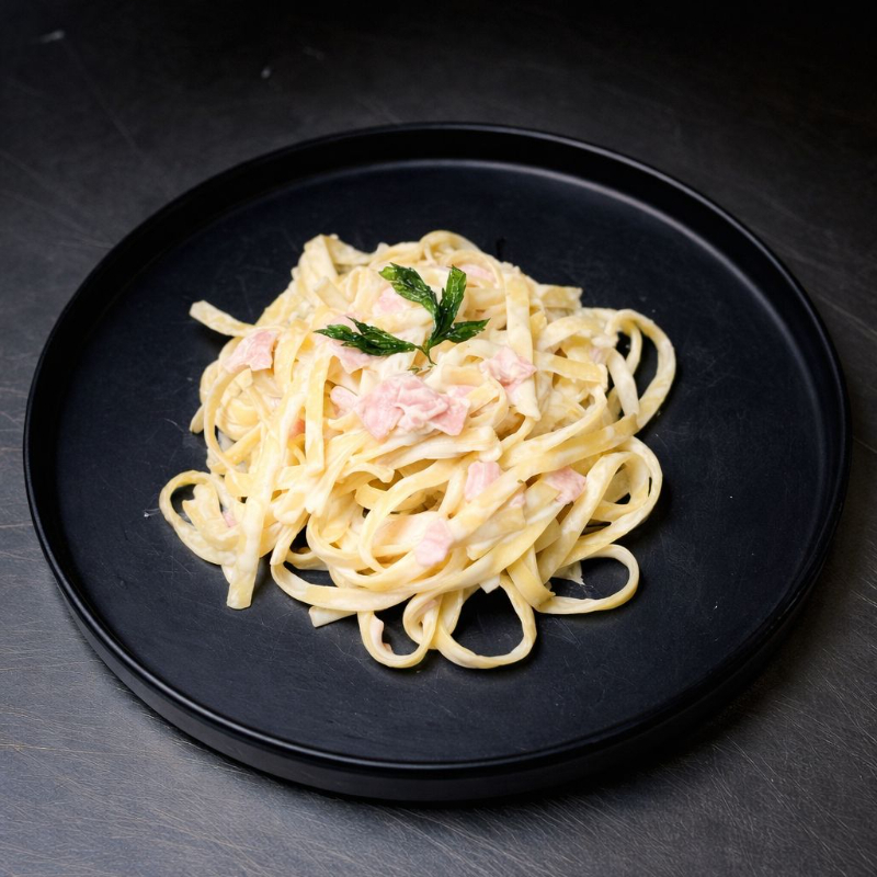 Pasta larga bañada en cremosa salsa alfredo, preparada al momento.