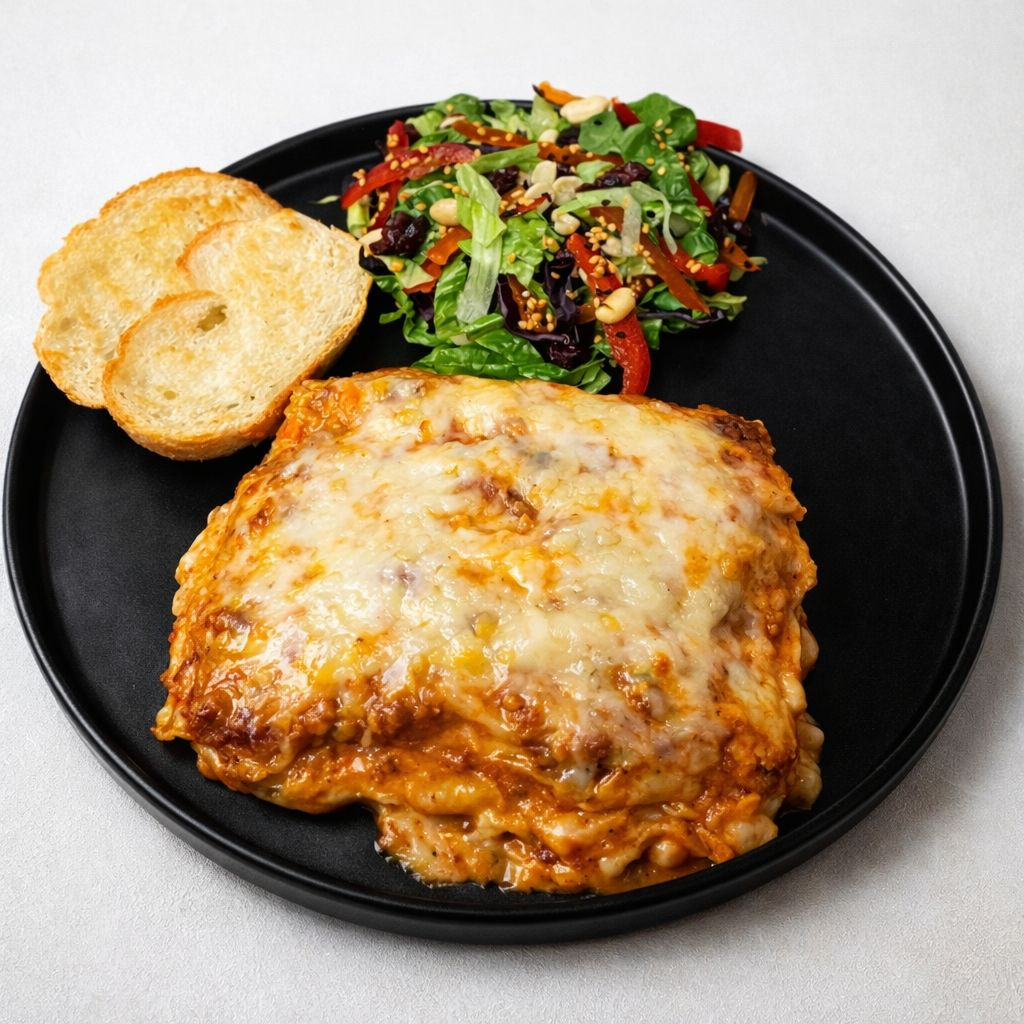 Horneada con capas de pasta, salsa y queso gratinado. Con ensalada y cuernito.