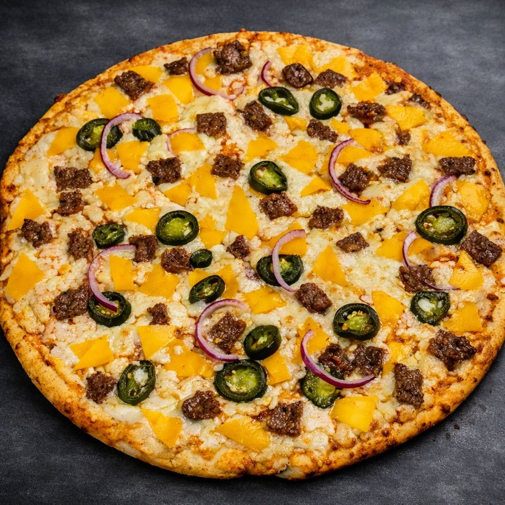 Sabor tradicional mexicano con carne al pastor 120 g, piña y cebolla.