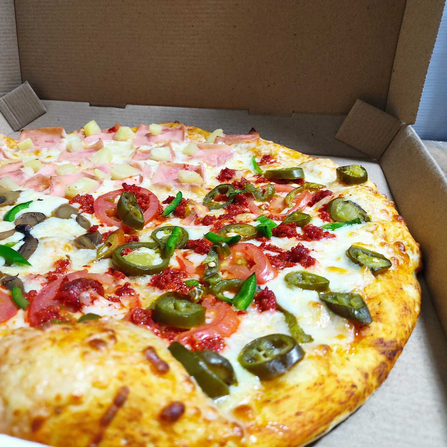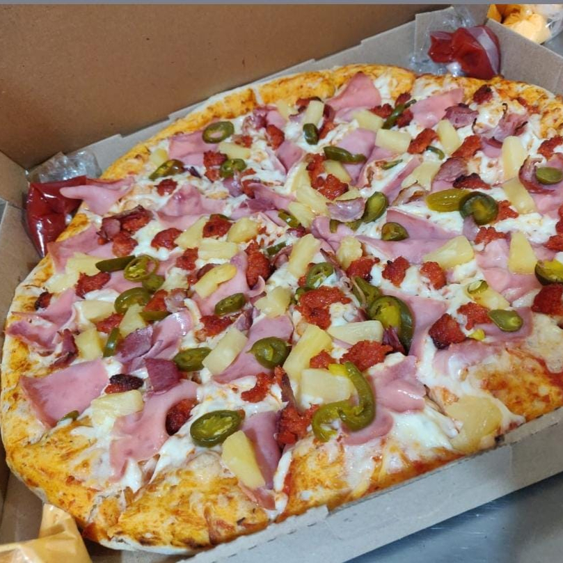Jamón, chorizo, tocino, piña y jalapeño.