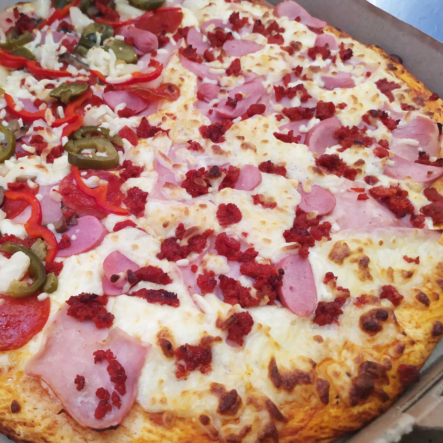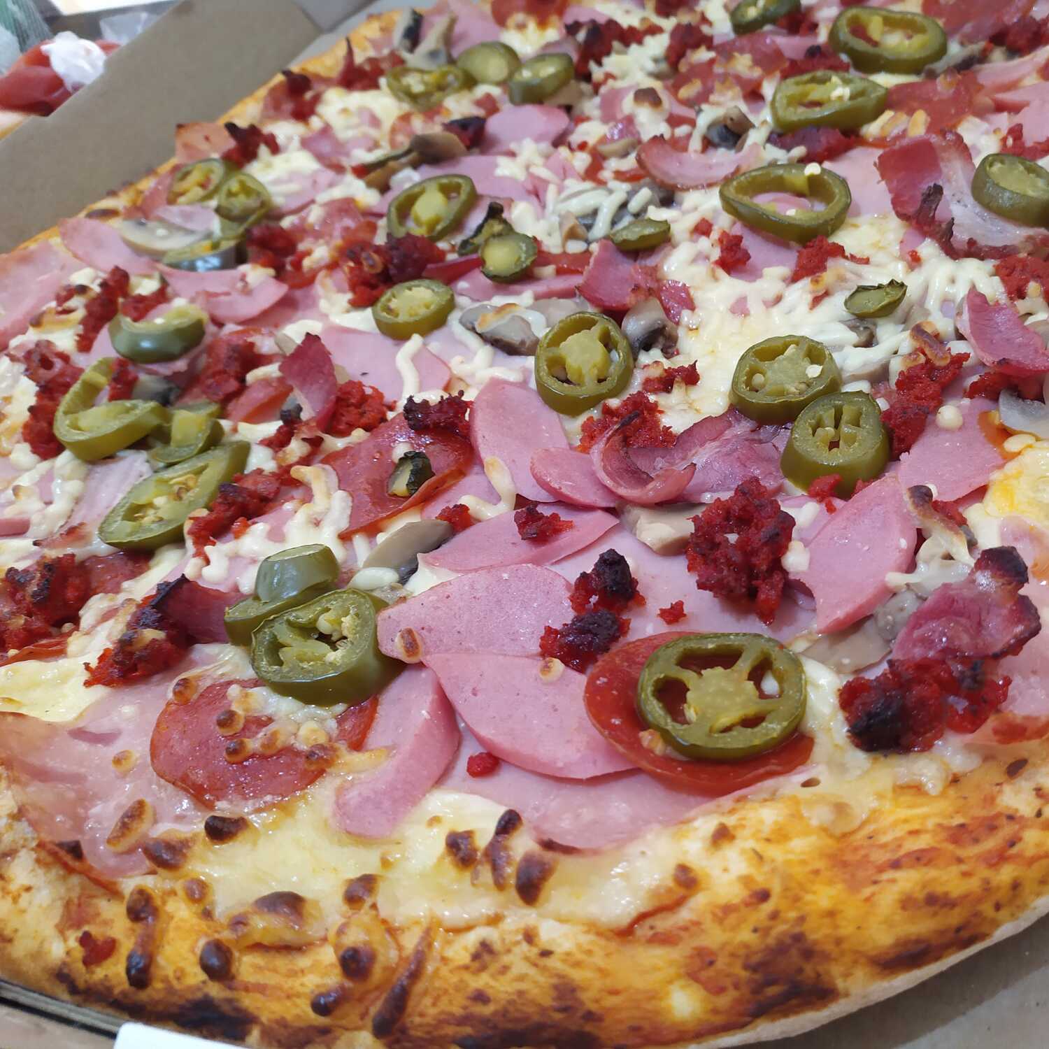 Jamón, salchicha, pepperoni, champiñón, chorizo, tocino, jalapeño y piña.