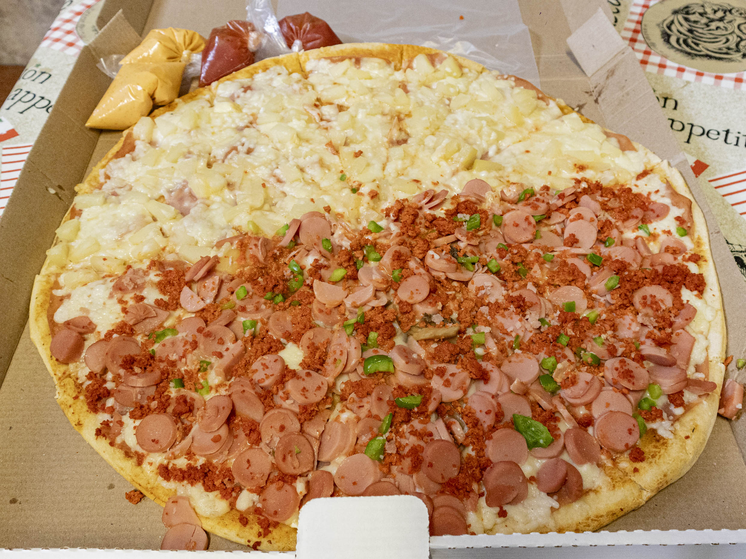 Jamón, piña, tocino, cebolla y pimiento. Incluye dos bolsitas de chimichurri y catsup.