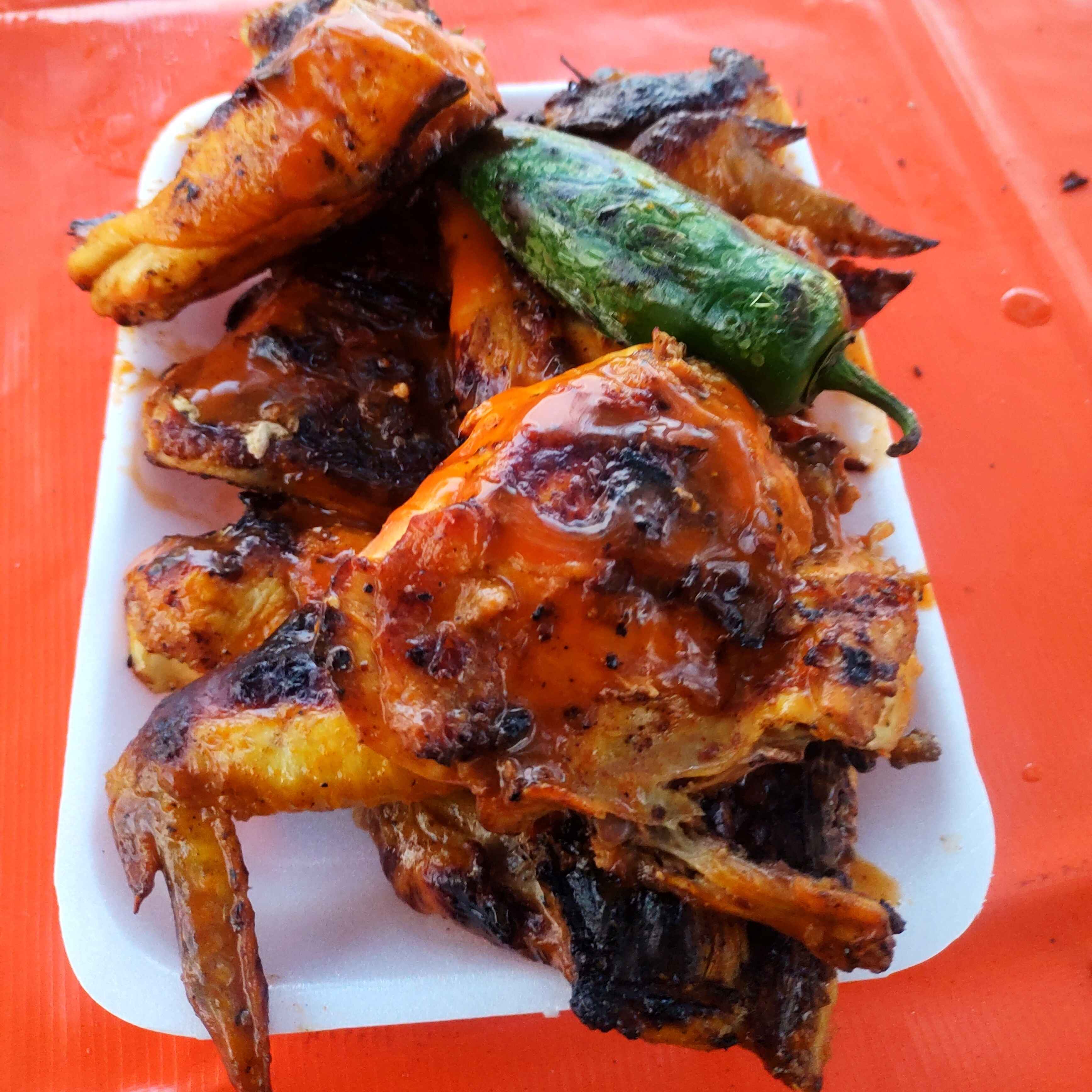 Pollo Asado al carbón marinado con nuestra receta y sazonado con salsa a la diabla dándote un sabor un poco picante incluye salsa, cebolla asada y chile asado.