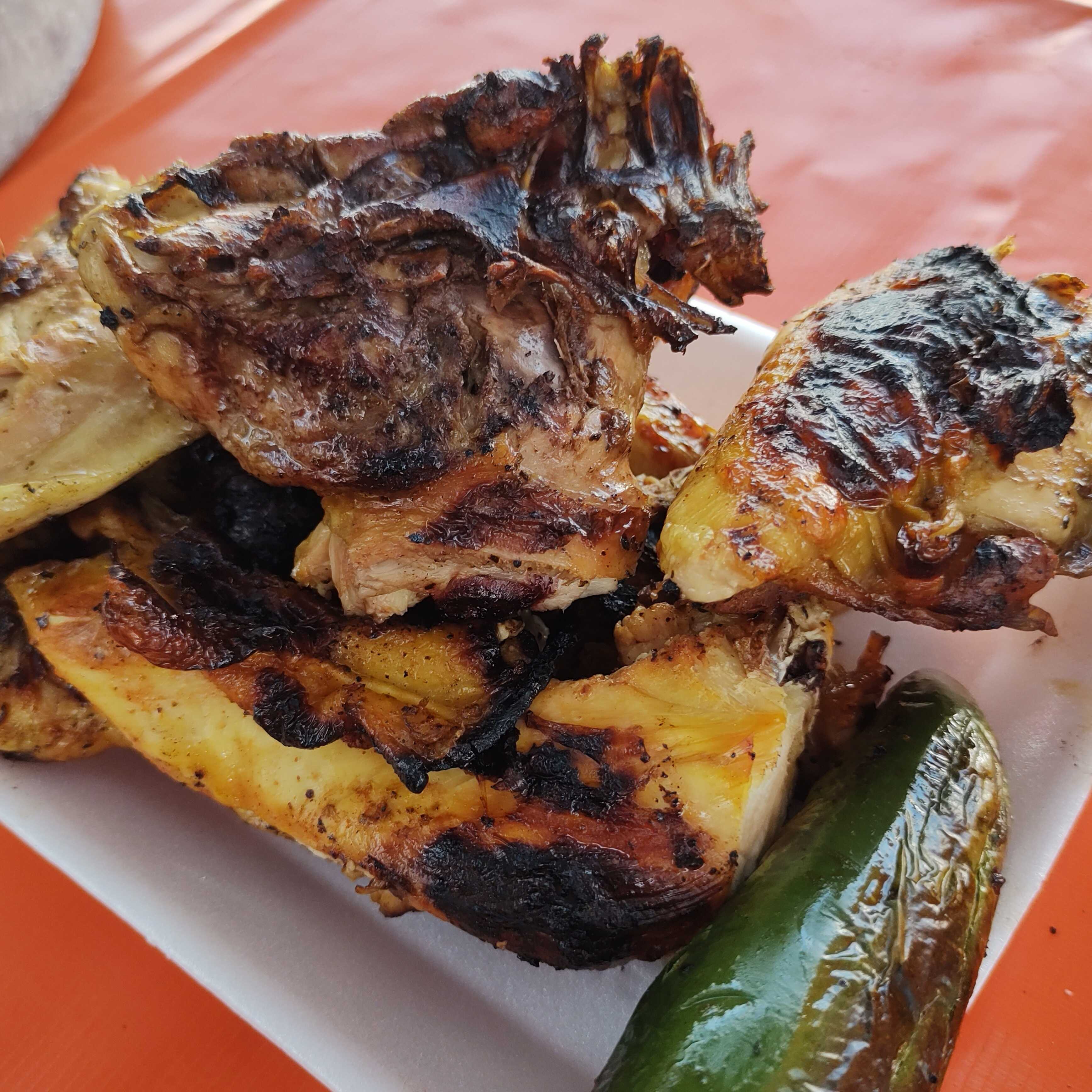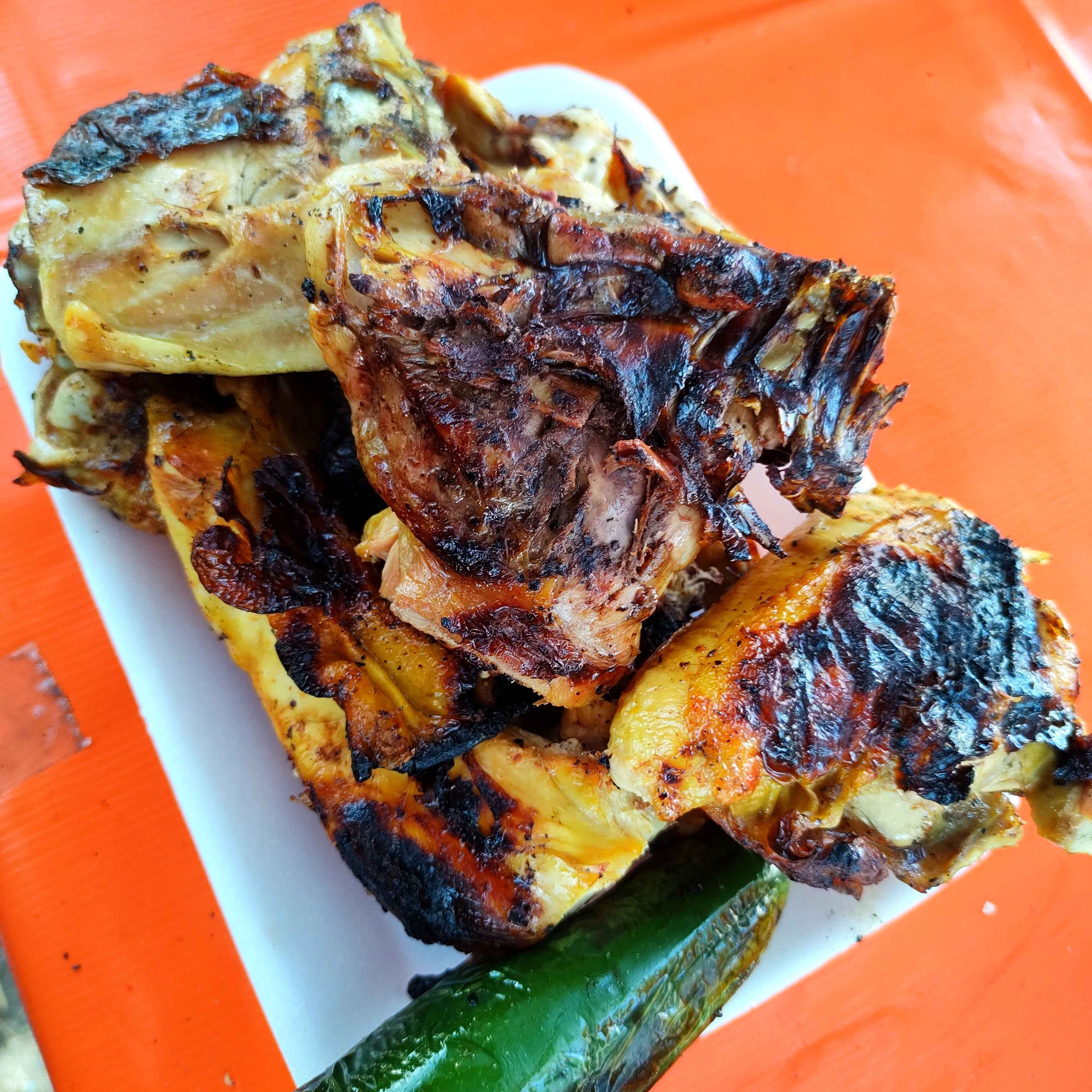 Pollo Asado al carbón marinado con nuestra receta y sazonado con salsa BBQ dándote un sabor un poco dulce Incluye salsa, cebolla asada y chile asado.